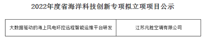 祝贺江苏兆胜空调有限公司作为项目承担单位,南京木禾环境科技有限公司和江苏科技大学作为项目协作单位联合成功申报2022年度江苏省海洋科技创新专项项目“大数据驱动的海上风电环控远程智能运维平台研发”并已通过实施方案论证!